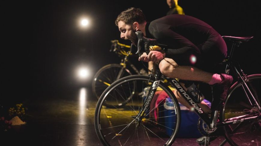 Il Pirata, Elefantino, much of Pantani’s career is masqueraded with a visage – from his large-eared childhood to his record for being the finest climber in cycling races, there are easy signifiers to Pantani’s characterisation. But performer Matthew Seager doesn’t rest on the laurels of 2MagpiesTheatre and director Andy Routledge’s production. Despite characterisation shortcuts, Seager’s commitment to the role is remarkably elegant and powerful. And with the effective video projection behind them, captured live at Ventoux, Seager’s more humble nature makes for a perfect contrast to Alexander Gatehouse’s suaver Armstrong.